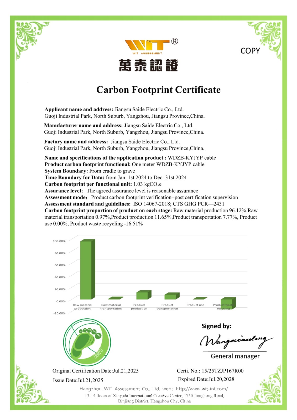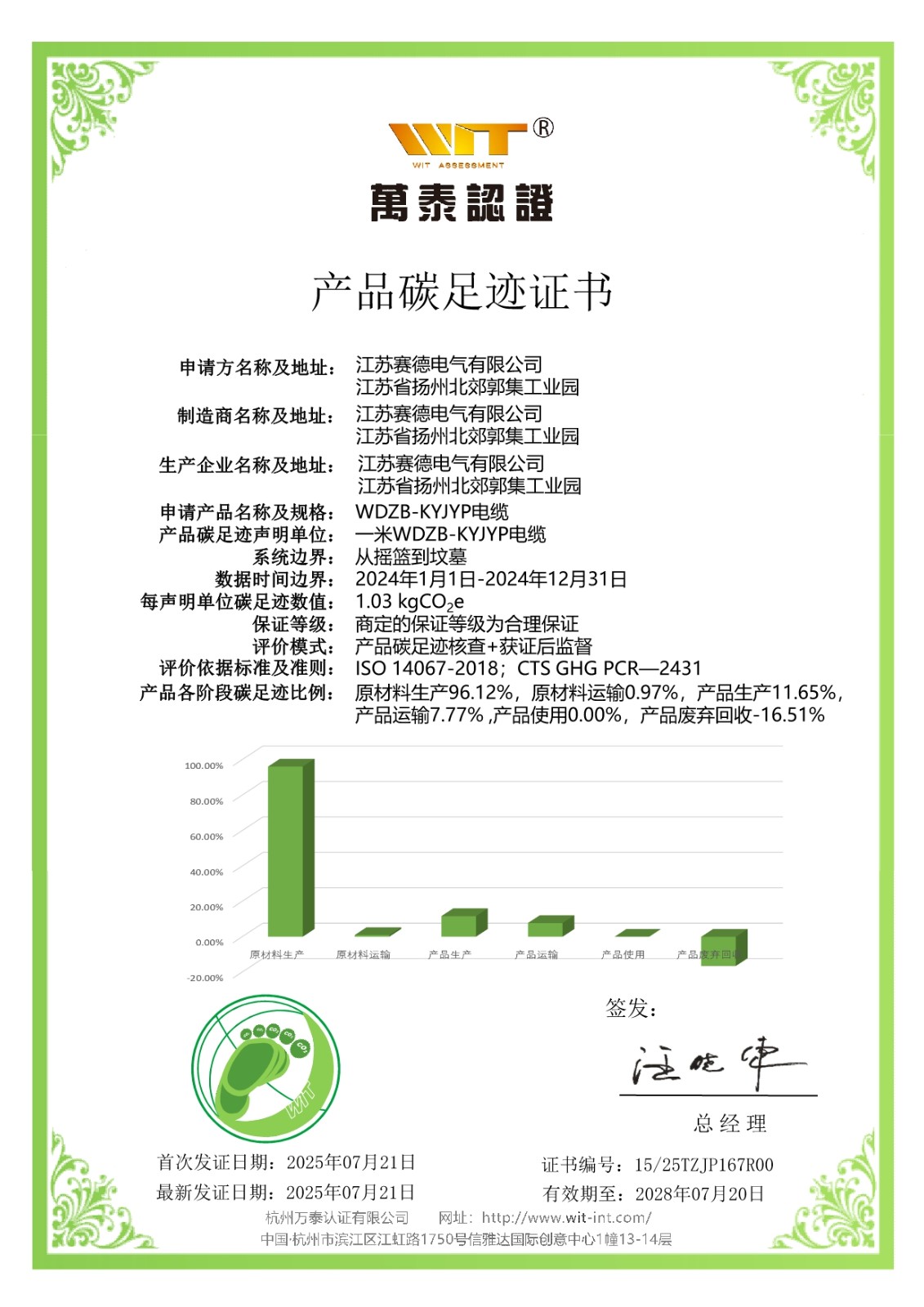 公司获得产品碳足迹证书